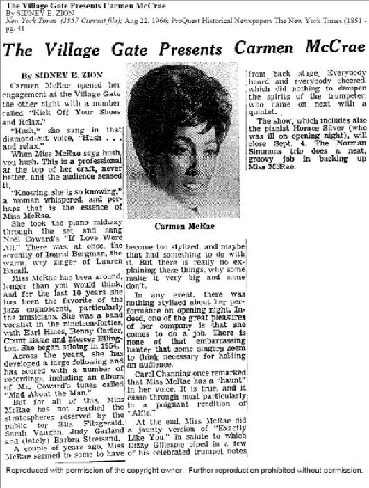 Home Press Overview Down Beat, September, 1954 - Ad thanking International Jazz Critics New York Times, November, 1955 - "Jazz Groups Play at Carnegie Hall" Down Beat, September, 1962 - "Singer's Singer Carmen McRae at the Threshold" New York Times, 1966 - review Carmen Live at the Village Gate Time Magazine, September, 1968 - "Ballad of the Sad Cafe Singer" Down Beat, December, 1968 - "The Magic of Carmen McRae" New York Times September, 1979 - review Carmen Live at the Village Gate Down Beat, June, 1991 - "Cut the Crap" |