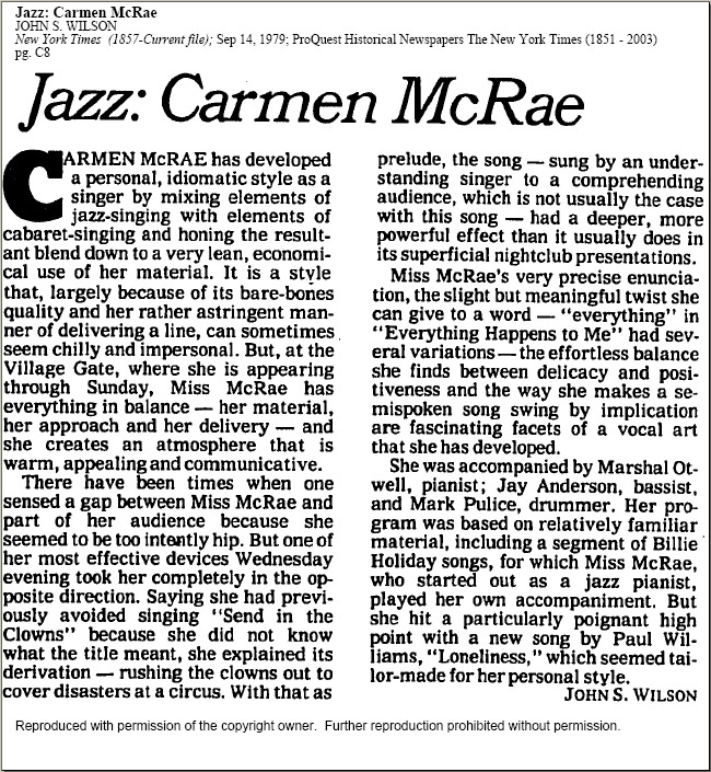 | Home Press Overview Down Beat, September, 1954 - Ad thanking International Jazz Critics New York Times, November, 1955 - "Jazz Groups Play at Carnegie Hall" Down Beat, September, 1962 - "Singer's Singer Carmen McRae at the Threshold" New York Times, 1966 - review Carmen Live at the Village Gate Time Magazine, September, 1968 - "Ballad of the Sad Cafe Singer" Down Beat, December, 1968 - "The Magic of Carmen McRae" New York Times September, 1979 - review Carmen Live at the Village Gate Down Beat, June, 1991 - "Cut the Crap" |