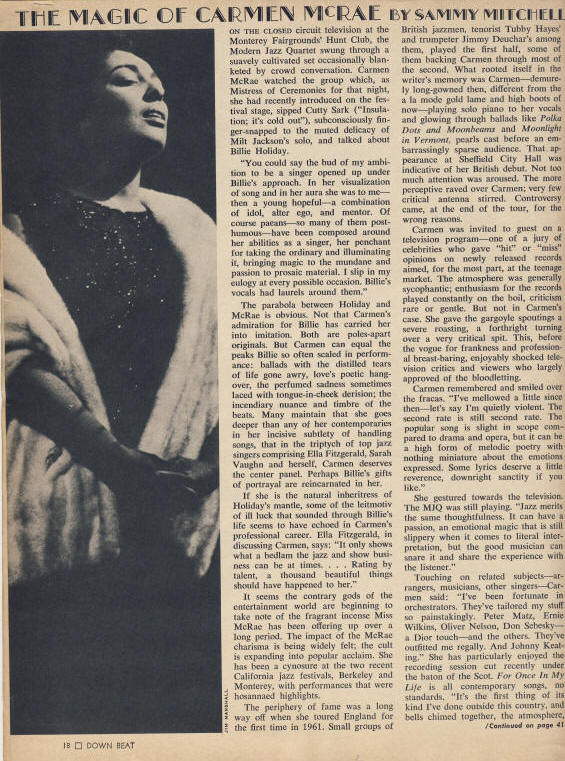 Home Press Overview Down Beat, September, 1954 - Ad thanking International Jazz Critics New York Times, November, 1955 - "Jazz Groups Play at Carnegie Hall" Down Beat, September, 1962 - "Singer's Singer Carmen McRae at the Threshold" New York Times, 1966 - review Carmen Live at the Village Gate Time Magazine, September, 1968 - "Ballad of the Sad Cafe Singer" Down Beat, December, 1968 - "The Magic of Carmen McRae" New York Times September, 1979 - review Carmen Live at the Village Gate Down Beat, June, 1991 - "Cut the Crap" |