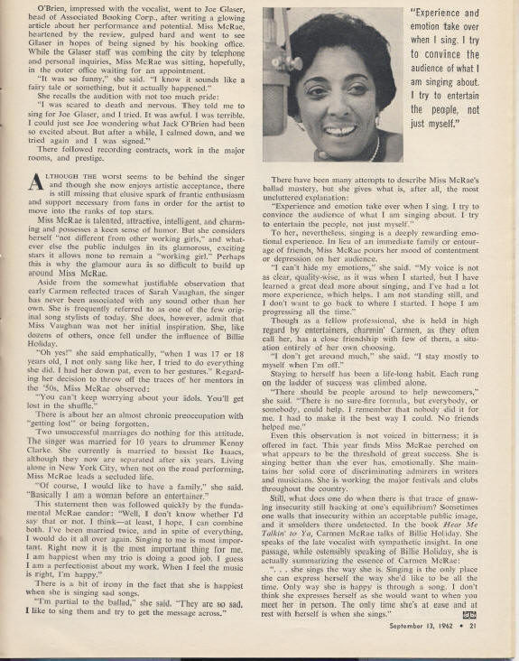 HomeXXXXXXXXXXX Press Overview Down Beat, September, 1954 - Ad thanking International Jazz Critics New York Times, November, 1955 - "Jazz Groups Play at Carnegie Hall" Down Beat, September, 1962 - "Singer's Singer Carmen McRae at the Threshold" New York Times, 1966 - review Carmen Live at the Village Gate Time Magazine, September, 1968 - "Ballad of the Sad Cafe Singer" Down Beat, December, 1968 - "The Magic of Carmen McRae" New York Times September, 1979 - review Carmen Live at the Village Gate Down Beat, June, 1991 - "Cut the Crap" |