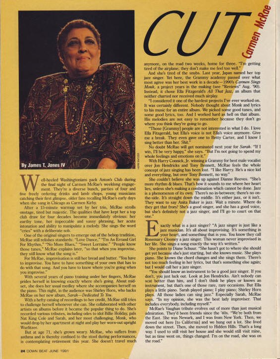 Home Press Overview Down Beat, September, 1954 - Ad thanking International Jazz Critics New York Times, November, 1955 - "Jazz Groups Play at Carnegie Hall" Down Beat, September, 1962 - "Singer's Singer Carmen McRae at the Threshold" New York Times, 1966 - review Carmen Live at the Village Gate Time Magazine, September, 1968 - "Ballad of the Sad Cafe Singer" Down Beat, December, 1968 - "The Magic of Carmen McRae" New York Times September, 1979 - review Carmen Live at the Village Gate Down Beat, June, 1991 - "Cut the Crap" |