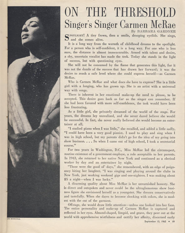 Home Press Overview Down Beat, September, 1954 - Ad thanking International Jazz Critics New York Times, November, 1955 - "Jazz Groups Play at Carnegie Hall" Down Beat, September, 1962 - "Singer's Singer Carmen McRae at the Threshold" New York Times, 1966 - review Carmen Live at the Village Gate Time Magazine, September, 1968 - "Ballad of the Sad Cafe Singer" Down Beat, December, 1968 - "The Magic of Carmen McRae" New York Times September, 1979 - review Carmen Live at the Village Gate Down Beat, June, 1991 - "Cut the Crap" |